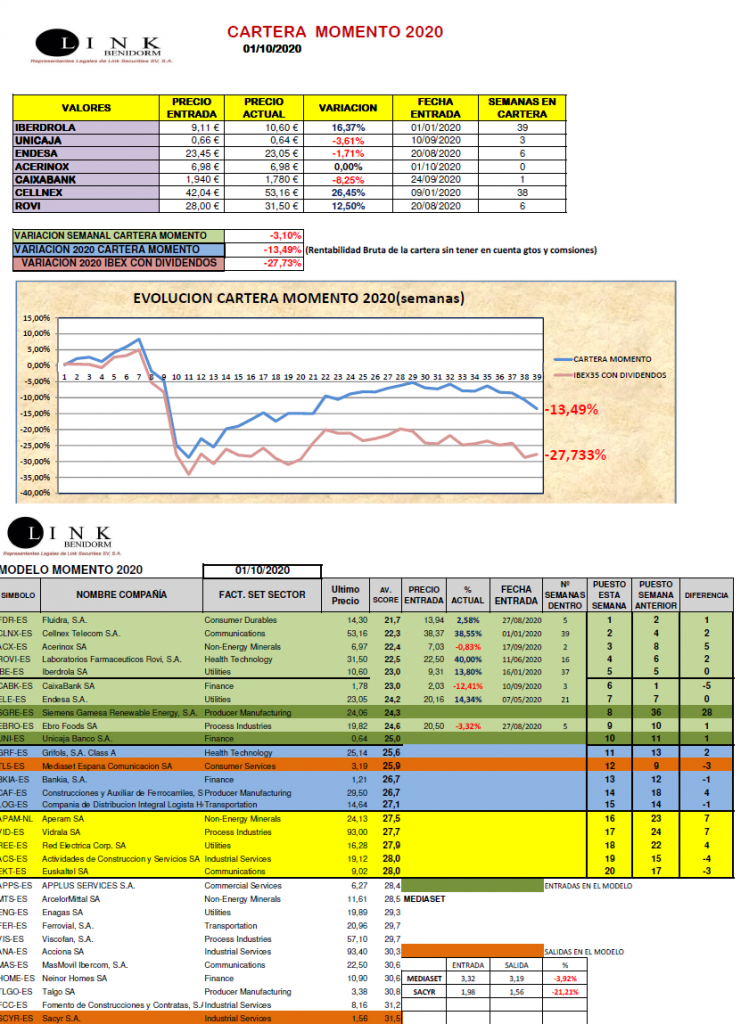 En nuestra Cartera Momento (obtenida a partir de la lista del Modelo Momento), se ha salido SACYR (-24,6%) y hemos incorporado ACERINOX en su lugar. También hemos aprovechado la subida que ha tenido Laboratorios Rovi para reducir su peso y poder dárselo a ACERINOX que con la pérdida de SACYR se había quedado descompensado. Hemos finalizado la semana con un descenso del -3,10% situándonos en 2020 con -13,49% , Y ya sabes…