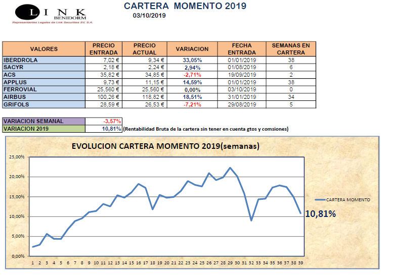 En nuestra Cartera Momento (obtenida a partir de la lista del Modelo Momento), esta semana hemos tenido descensos en varios valores, debidas en mayor medida por el incremento de aranceles que la OMC ha aprobado sobre determinados productos Europeos, así como noticias negativas que han habido sobre CIE y que finalmente ha provocado que se salga de nuestra Cartera Momento después de 15 semanas con un descenso del -15,61%, En su lugar ha entrado FERROVIAL . Hemos concluido la semana con un descenso del -3,57% , situándonos en lo que va de 2019 con +10,81%.