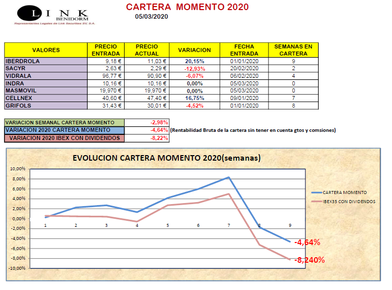 Semana complicada de nuevo en los mercados, en los que las caídas han vuelto a ser la constante debido al “Coronavirus” y su más que previsible impacto en la economía. Esta semana se han salido del Modelo Momento ROVI +2,02% , APERAM -17,70% , BME -0,46% e IAG -30,33% incorporándose en su lugar INDRA, TECNICAS REUNIDAS, ACCIONA y FERROVIAL.