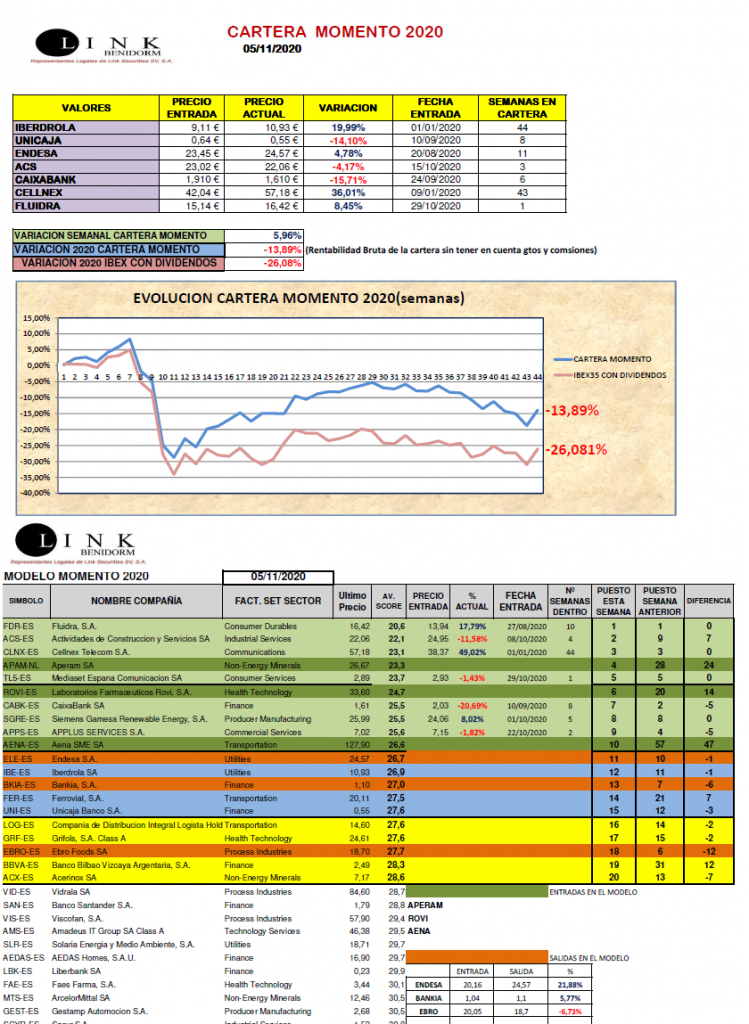 En nuestra Cartera Momento (obtenida a partir de la lista del Modelo Momento), no hemos hecho movimientos. Hemos finalizado la semana con una revalorización del +5,96% situándonos en 2020 con -13,89% , Y ya sabes…