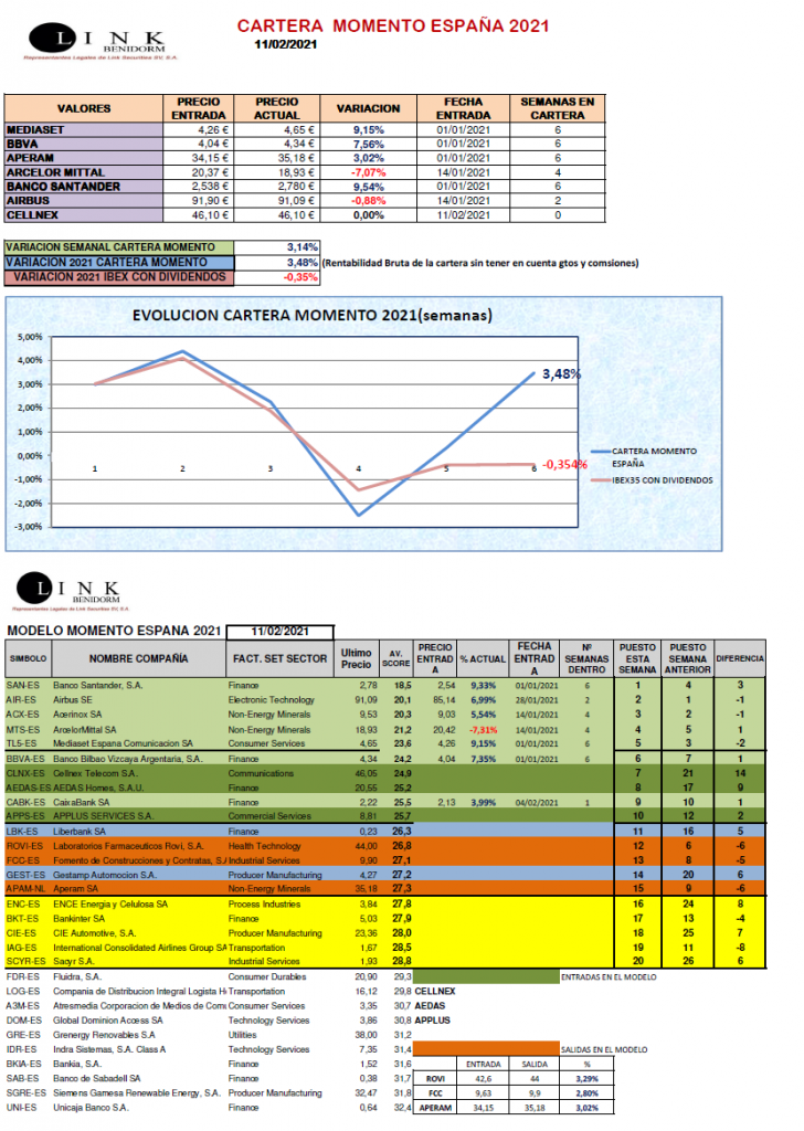 Semana muy positiva para nuestra CARTERA MOMENTO ESPAÑA que se ha portado mucho mejor que el mercado. Esta semana hemos extraído a ROVI (+2,60%) incorporando a CELLNEX en su lugar. Hemos concluido la semana con una fantástica revalorización del +3,14%, situándonos en 2021 un +3,48%.