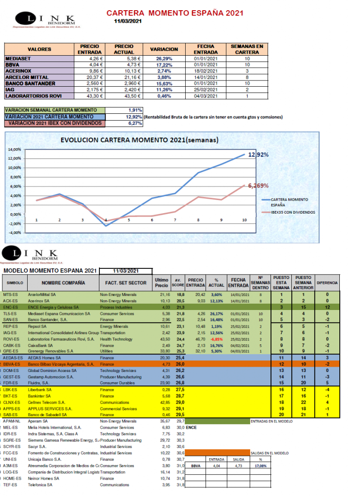 Semana de nuevo positiva para los mercados y también para nuestra CARTERA MOMENTO ESPAÑA . Muy buen comportamiento de ACERINOX, ARCELOR y MEDIASET que han obtenido unas destacadas revalorizaciones. Esta semana no hemos hecho movimientos en nuestra CARTERA MOMENTO ESPAÑA que ha acabado con una revalorización del +1,91%, situándonos en 2021 un +12,92%.