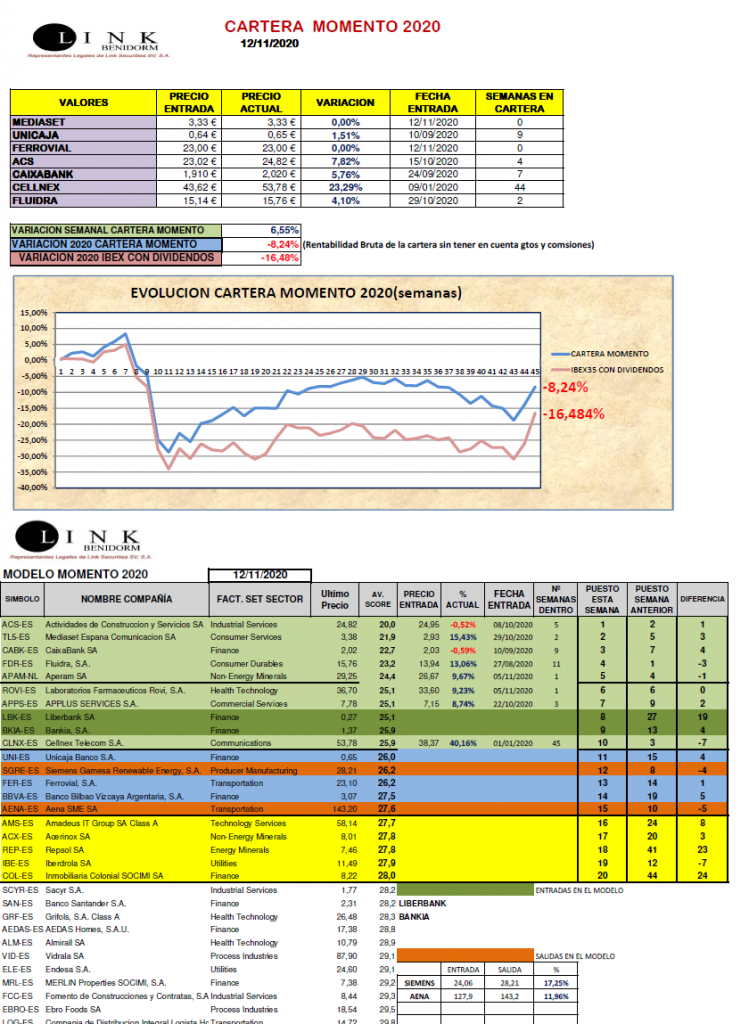 Semana que ya hacía falta en los mercados y que tras el anuncio de los resultados positivos de la vacuna de PFIZER ha hecho que los valores más castigados hasta la fecha hayan subido de forma espectacular, quedándose aquellos valores que mejor lo habían estado haciendo hasta el momento más rezagados e incluso con pérdidas. Esta semana se han salido del MODELO MOMENTO SIEMENS GAMESA (+17,25%) y AENA (+11,96%), entrando en su lugar LIBERBANK y BANKIA.