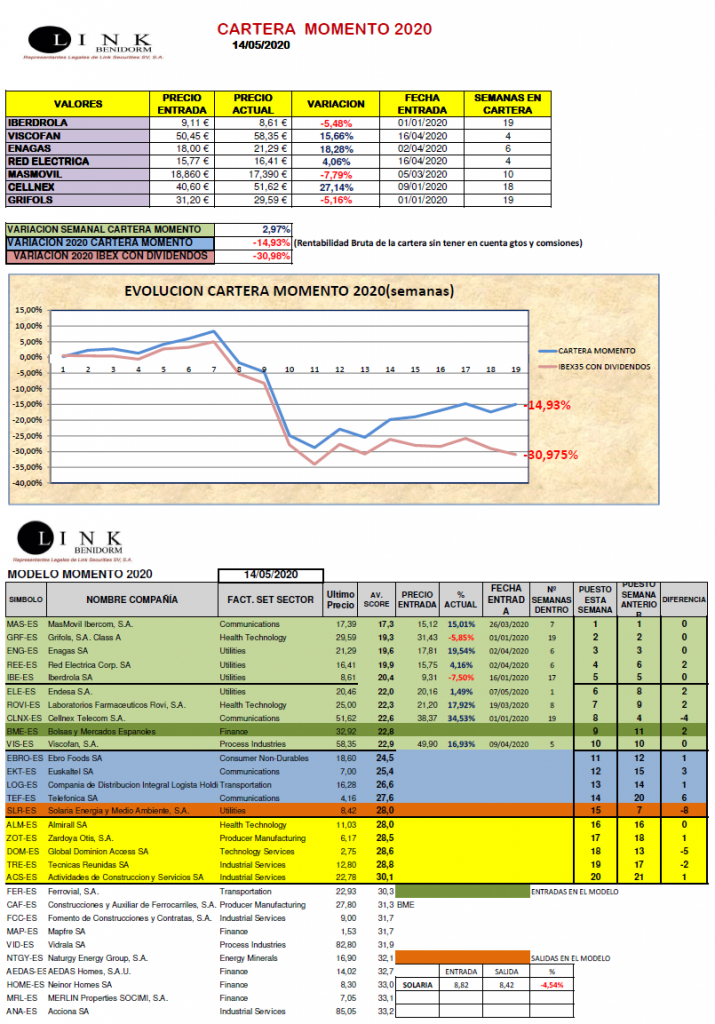 Nuestra Cartera Momento (obtenida a partir de la lista del Modelo Momento) ha experimentado un comportamiento ESPECTACULAR desmarcándose de la tendencia del mercado gracias al excelente comportamiento de CELLNEX, VISCOFAN, RED ELECTRICA, ENAGAS y en el día de hoy MASMOVIL. Está claro que en los momentos que estamos viviendo son valores que pertenecen a sectores menos penalizados por situación actual y así lo están reflejando. Esta semana por su puesto no hemos cambiado a ningún valor pero sí que hemos hecho un ajuste general de ponderaciones, reduciendo el peso de VISCOFAN y CELLNEX e incrementando el peso de MASMOVIL, GRIFOLS, IBERDROLA y RED ELECTRICA. Hemos concluido la semana con una revalorización del +2,97% situándonos en 2020 con -14,93% , una caída inferior al 50% a la experimentada por el mercado, y más de 16% de diferencial al IBEX-35 con dividendos. Y ya sabes
