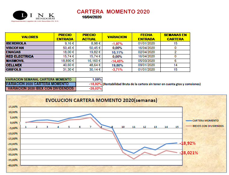 En nuestra Cartera Momento (obtenida a partir de la lista del Modelo Momento), hemos tenido dos salidas, ENCE -1,82% y LOGISTA -2,02% , incorporando en su lugar RED ELECTRICA y VISCOFAN. Esta semana hemos logrado un magnífico comportamiento (en términos relativos al mercado) gracias a la fuerte subida de ENAGAS y sobre todo CELLNEX. La Cartera Momento se nos ha posicionado de forma muy defensiva con 3 valores energéticos (IBERDROLA, REE, ENAGÁS) que consideramos positivo en la situación de incertidumbre que estamos atravesando. Hemos concluido la semana con una revalorización de +1,09% situándonos en 2020 con -18,92% y ya sabes: