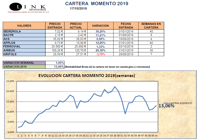 En nuestra Cartera Momento (obtenida a partir de la lista del Modelo Momento), no hemos hecho variaciones. Hemos concluido la semana con una revalorización del +1,50% , situándonos en lo que va de 2019 con +13,06%.