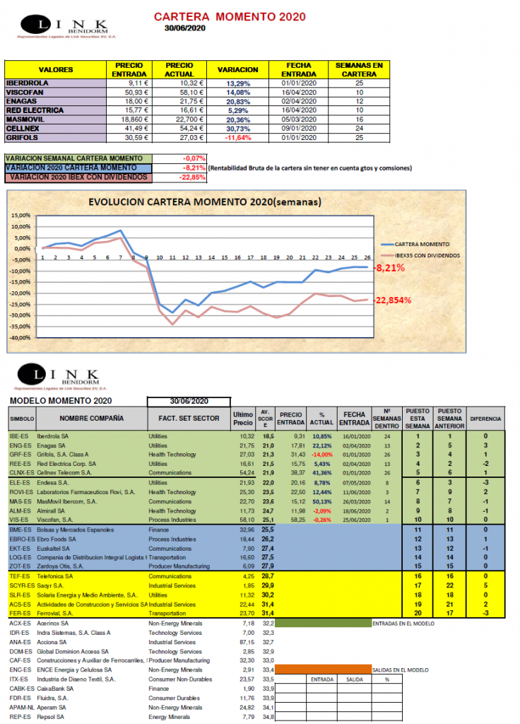 Una vez concluido el primer semestre de 2020 podemos hacer balance del mismo, que podemos calificar como muy complicado en el que nos hemos enfrentado nada más y nada menos que a una pandemia, en la que todavía estamos inmersos y que no sabemos en profundidad cuales serán las consecuencias reales de la misma. Ha sido una prueba de fuego para nuestro MODELO MOMENTO y nuestra Cartera Momento (obtenida a partir de la lista del Modelo Momento) y que bajo nuestro punto de vista ha tenido un comportamiento excelente -8,21% en comparación con el mercado (-22,85% IBEX-35 CON DIVIDENDOS, con un diferencial récord) y en el que hemos comprobado que en un mercado bajista como este, nuestra CARTERA MOMENTO ha sido capaz de rotar hacia valores de corte más defensivo y que han sufrido un menor impacto a esta situación como pueden ser (Energía, tecnología, alimentación, farmaceútico, etc.) Ha sido un semestre duro en el que hemos sufrido salidas con importantes pérdidas como SACYR -38,5% o IAG que salimos en 5,06€ con una pérdida del -29,90% pero que luego hemos visto que se fueron por debajo de los 2€, y con incorporaciones posteriores muy positivas como han sido el caso de MASMOVIL que a pesar de la bajada que experimentó inicialmente recuperó rápidamente hasta los 22,70€ que ha cerrado o ENAGAS, VISCOFAN y RED ELECTRICA. No podíamos dejar pasar el fantástico comportamiento que han tenido CELLNEX e IBERDROLA, muy beneficiados por el contexto y porque no decirlo por la gestión llevada a cabo.