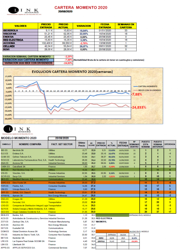 En nuestra Cartera Momento (obtenida a partir de la lista del Modelo Momento), hemos vuelto a tener variaciones, extrayendo también después de 33 semanas a GRIFOLS con un retroceso del -20,61%. No sabemos si ha sido el retraso de la junta de accionistas y del dividendo esperado, o de las pérdidas anunciadas por el COVID-19 y el impacto que la revalorización del dólar pueda tener en sus cuentas, el caso es que a pesar de que no han habido numerosas revisiones a la baja por parte de analistas se ha terminado saliendo principalmente por precio. También se nos ha salido de ENAGAS después de 20 semanas con una revalorización del +16,49%. En sustitución de ambas, se han incorporado ENDESA y LABORATORIOS ROVI. Hemos finalizado la semana con un descenso del -2,25% situándonos en 2020 con -7,88% , Y ya sabes…