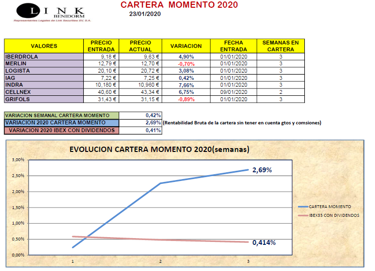 En nuestra Cartera Momento (obtenida a partir de la lista del Modelo Momento), no hemos hecho variaciones al estar nuestros valores muy bien posicionados en el Modelo Momento. Hemos terminado la semana con una revalorización del +0,42% situándonos en 2020 con un +2,69%.