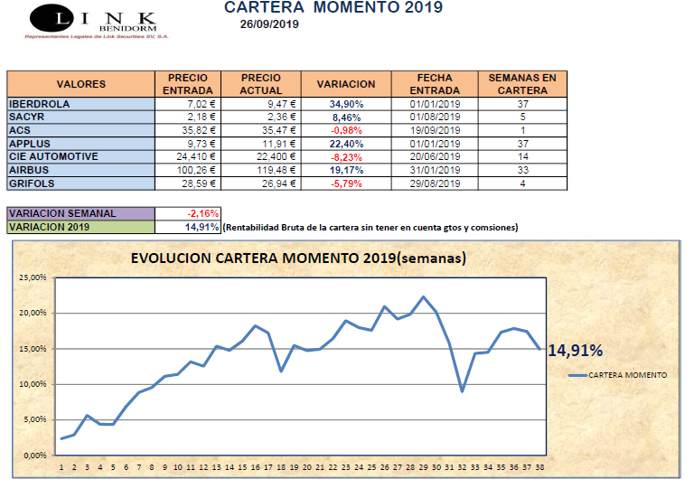 Cartera Momento 26-09-2019 -2,16% en la semana +14,91% en 2019