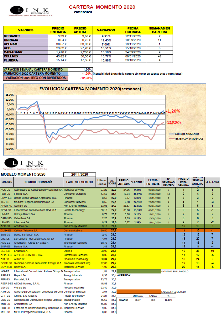 Semana positiva de nuevo en los mercados, a pesar de que en los últimos días hemos asistido a una “recogida de beneficios”, nos ha permitido por momentos situar a nuestra CARTERA MOMENTO en positivo en 2020! Esta semana se ha salido del MODELO MOMENTO CELLNEX (+31,61%), entrando en su lugar ACERINOX.
