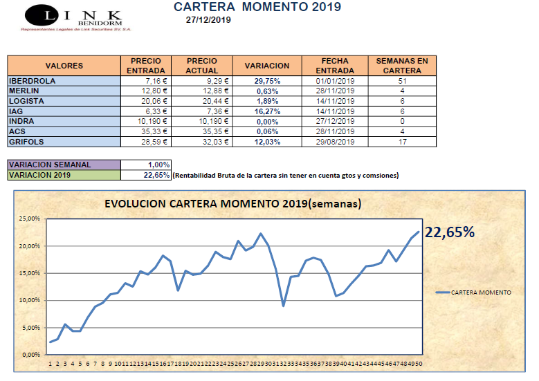 Cartera Momento 27-12-2019 +1,00% en la semana +22,65% en 2019