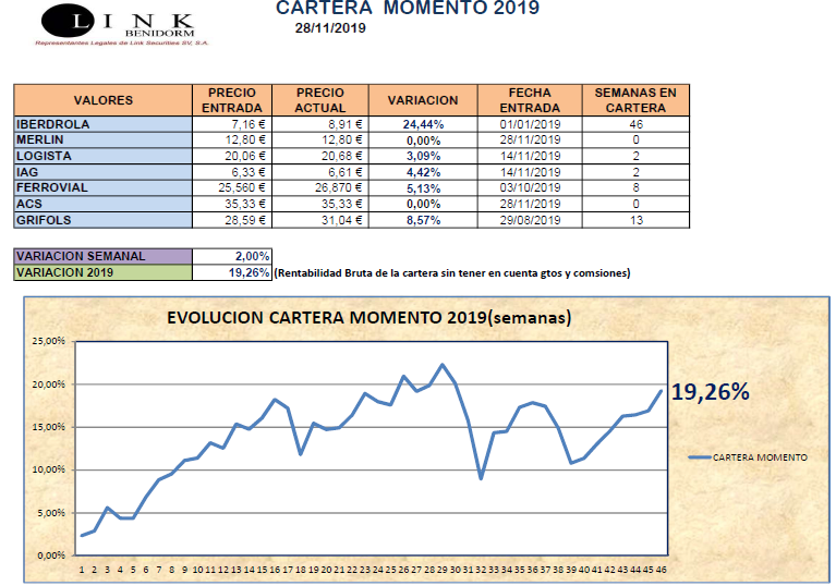 En nuestra Cartera Momento (obtenida a partir de la lista del Modelo Momento), esta semana sí que hemos hecho varias operaciones. Después de 42 semanas en nuestra cartera, despedimos a AIRBUS con una extraordinaria revalorización del +32,68%. También se ha salido después de 14 semanas SACYR con una fantástica revalorización del +15,07%. En su lugar hemos incorporado MERLIN y ACS que esperemos tengan similar comportamiento. En esta semana se ha descontado un dividendo en IAG DE 0,145€ brutos por acción que se cobrará en los próximos días. También hemos aprovechado la subida que ha tenido GRIFOLS en esta semana para reducir el peso e incrementarlo en IBERDROLA, IAG y LOGISTA. Hemos concluido la semana con una revalorización del +2,00% , situándonos en lo que va de 2019 con fantástico +19,26%.