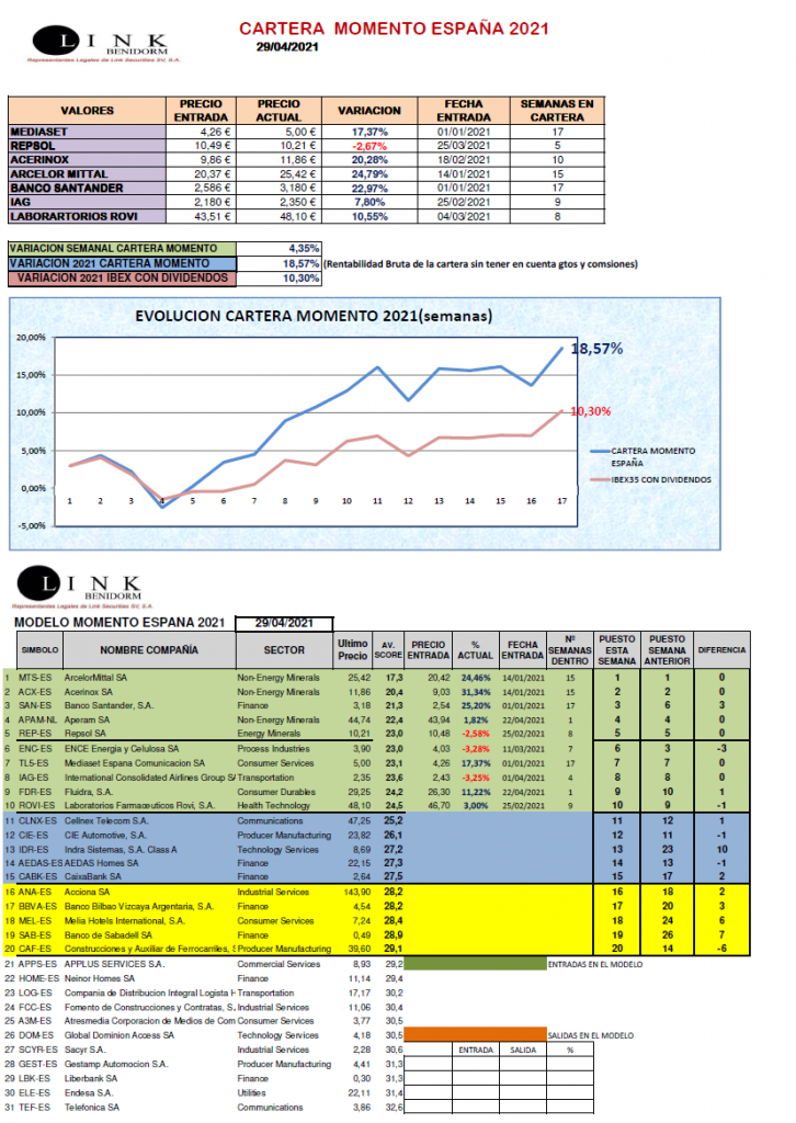 Muy buena semana en los mercados y que así se ha visto reflejado en nuestra CARTERA MOMENTO ESPAÑA, que ha alcanzado máximos en este 2021. Gran comportamiento de MEDIASET (tras las últimas semanas de bajadas) y sobre todo de BANCO SANTANDER. Seguimos sin hacer cambios en la composición de la Cartera (y ya van 5 semanas seguidas). Hemos terminado la semana con una magnífica revalorización del +4,35%, situándonos en 2021 un +18,57%.