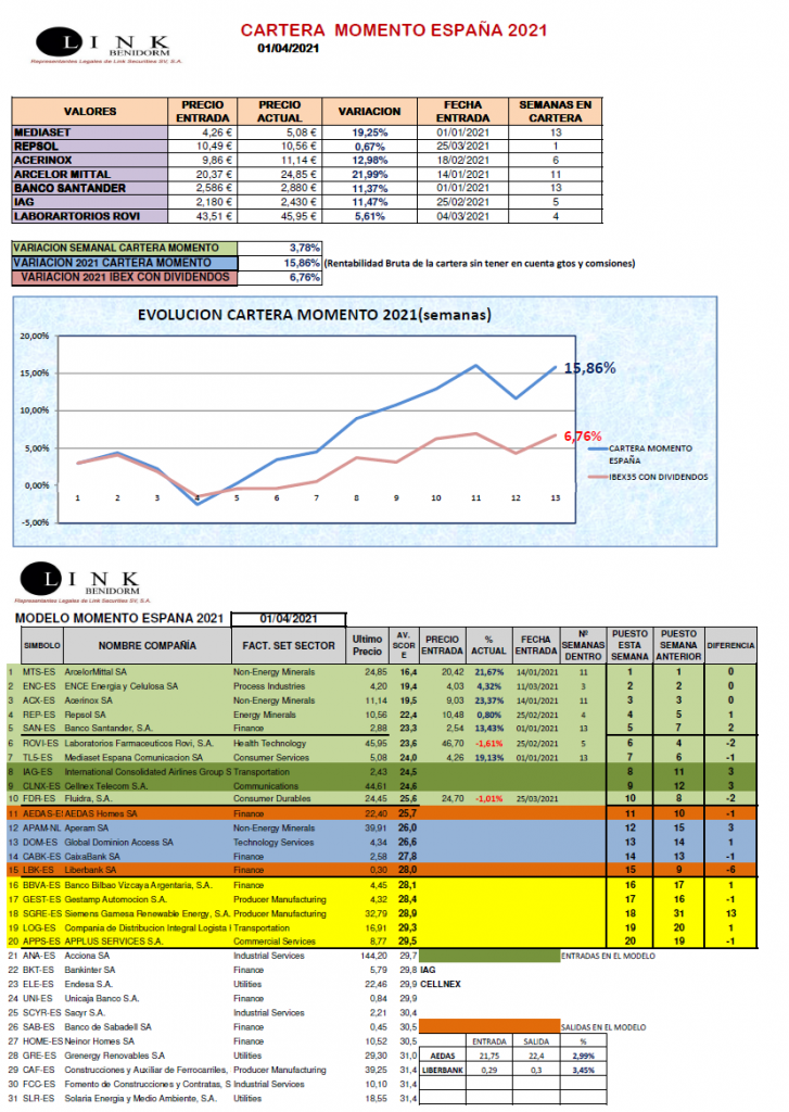 Cartera Momento España 01-04-2021 +3,78% en la semana, +15,86% en 2021
