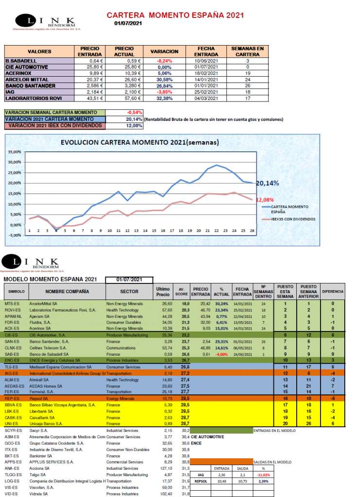 Cartera Momento España 01-07-2021 -0,54% en la semana, +20,14% en 2021