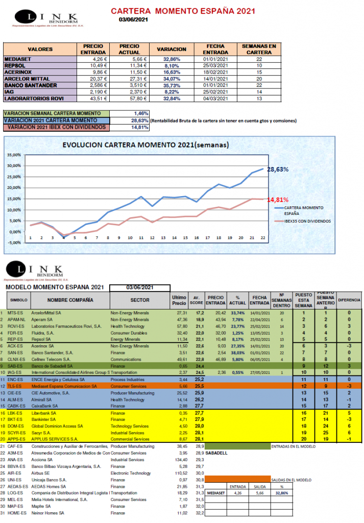 Esta semana los valores pertenecientes al sector eléctrico han acaparado la atención en los mercados (de forma negativa) y a pesar de la buena subida de los valores del sector bancario han hecho que los índices se hayan quedado prácticamente planos. Por el contrario a nosotros en nuestra CARTERA MOMENTO ESPAÑA nos ha favorecido el gran comportamiento de BANCO SANTANDER, REPSOL y de nuevo LABORATORIOS ROVI . Esta semana nos han descontado un dividendo de 0,50€ en ACERINOX (que todavía no está incluído en la Cartera). Hemos finalizado la semana con una revalorización del +1,46%, situándonos en 2021 un +28,63%!!!.