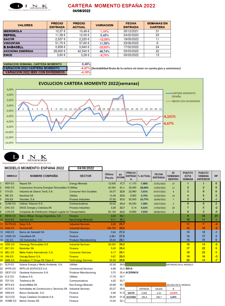 Semana típica del mes de agosto en los mercados, con poco volumen y sin demasiado movimiento como habíamos tenido en las semanas precedentes. Seguimos sin hacer cambios en nuestra CARTERA MOMENTO ESPAÑA y finalizamos la semana con una revalorización del +0,49% , situándonos en 2022 con un -6,67%