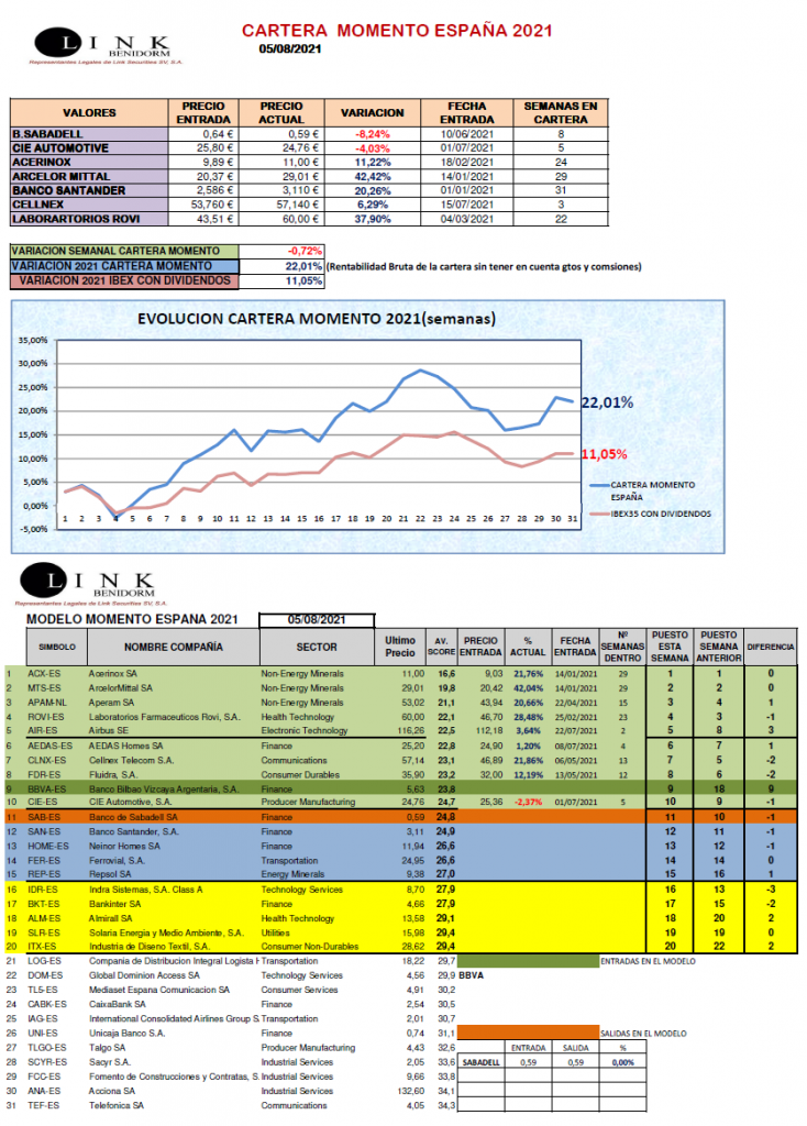 Semana de transición de nuestra CARTERA MOMENTO ESPAÑA en la que los valores que mejor se habían comportado como ARCELOR, ACERINOX, y LABORATORIOS ROVI han cedido ligeramente, y por el contrario CELLNEX ha tenido muy buena semana alcanzando máximos anuales. Hemos terminado la semana con un descenso del -0,72%, situándonos en 2021 un +22,01%.