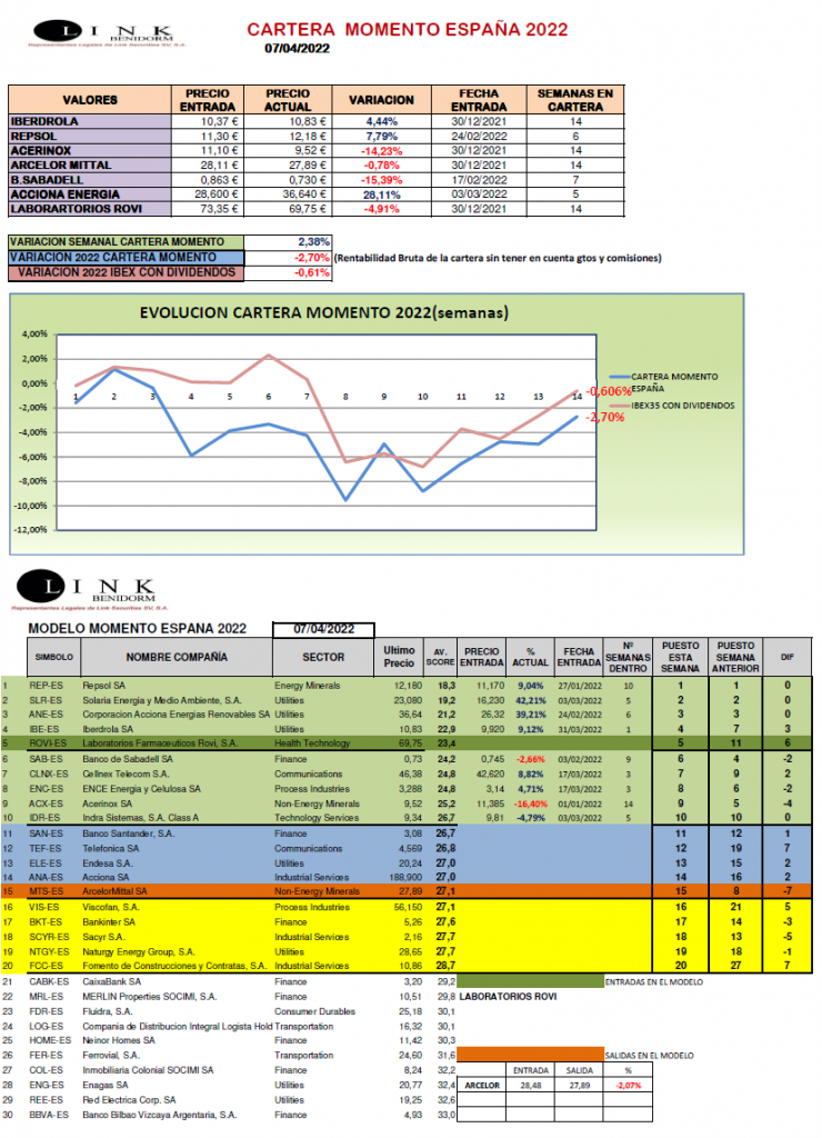 Cartera Momento España 07-04-2022 +2,38% en la semana, -2,70% en 2022