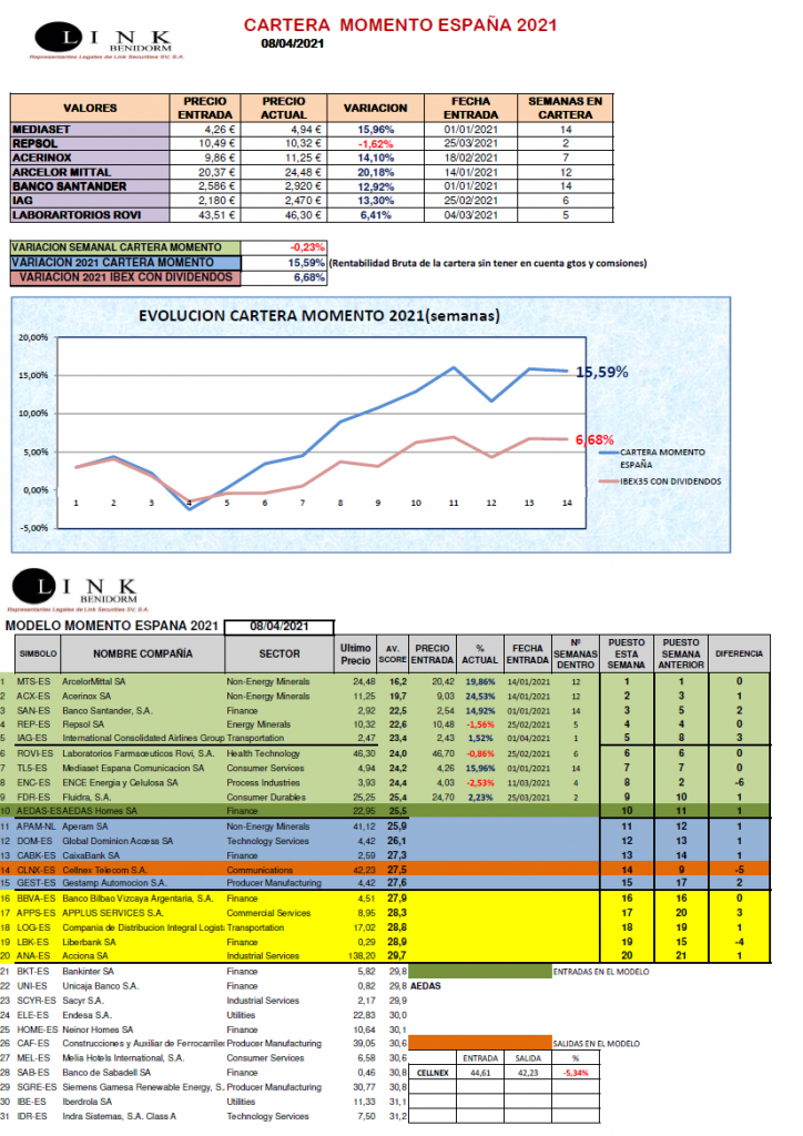 Semana corta en los mercados tras dos días festivos en la que no tenemos movimientos en nuestra CARTERA MOMENTO ESPAÑA. Hemos terminado la semana con un descenso del -0,23%, situándonos en 2021 un +15,59%.