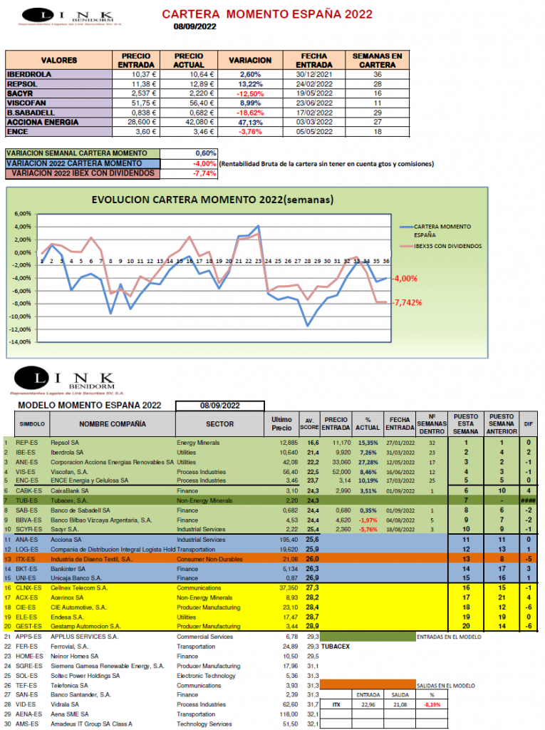 Cartera Momento España 08-09-2022 +0,60% en la semana, -4,00% en 2022