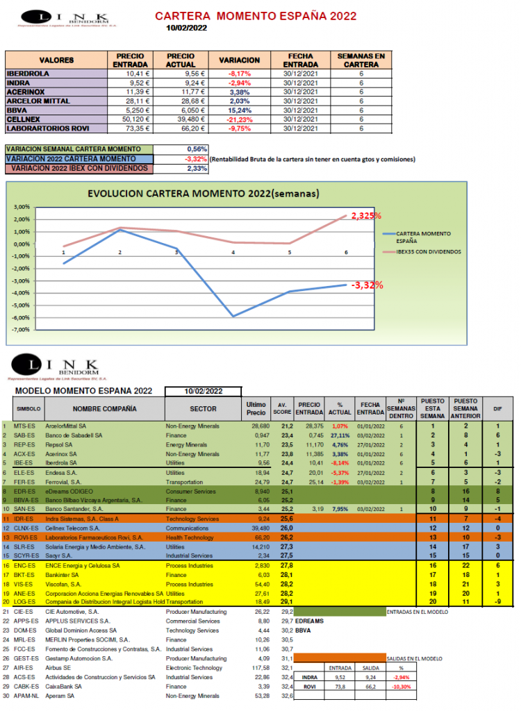 Semana positiva para los mercados siendo la Bolsa Española una de las más favorecidas debido a los avances de los valores pertenecientes al sector bancario. Nuestra CARTERA MOMENTO ESPAÑA que se ha visto penalizada por los retrocesos de CELLNEX e IBERDROLA, ha conseguido cerrar en positivo gracias al fantástico comportamiento de BBVA. Finalizamos la semana con una revalorización del +0,56% situándonos en 2022 con un -3,32%.