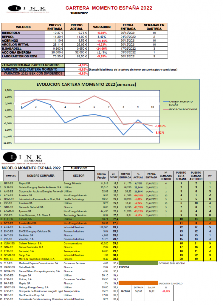 Difícil semana que hemos vivido en la que los analistas todavía no han entrado a valorar el impacto que puede llegar a tener el conflicto Rusia-Ucrania y las sanciones a Rusia en las empresas cotizadas. Esta semana no hemos tenido salidas en nuestra CARTERA MOMENTO ESPAÑA pero hemos aprovechado la fantástica revalorización de ACCIONA ENERGÍA para reducir su peso e incrementar el de ACERINOX , con fuerte descenso. Terminamos la semana con un retroceso del -4,09% situándonos en 2022 con un -8,82%.