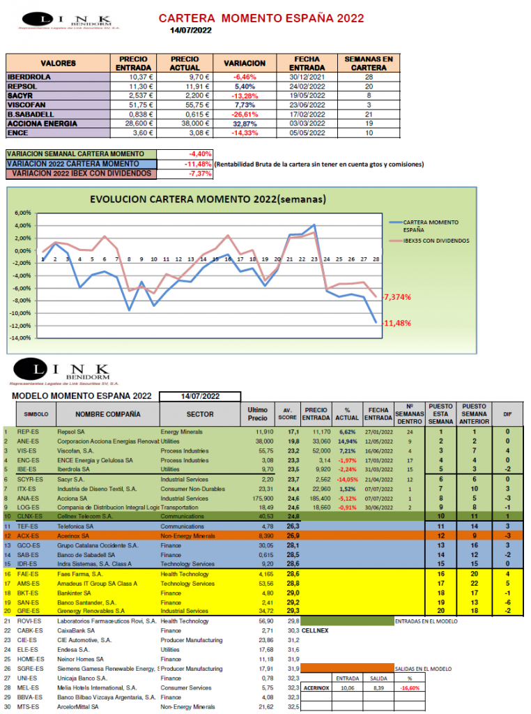 Semana negativa de nuevo, sobre todo para la Bolsa Española que lo había estado haciendo mucho mejor que el resto de mercados y que el anuncio por parte del gobierno de nuevos impuestos a las empresas energéticas y bancarias ha provocado una oleada de ventas hasta que se aclaren el método y alcance para implementar dichos nuevos impuestos. Nuestra CARTERA MOMENTO ESPAÑA con importante presencia en dichos sectores ha sido duramente castigada. Esta semana hemos vendido los derechos de la ampliación de IBERDROLA por el dividendo y seguimos sin hacer movimientos en la composición de la Cartera. Finalizamos la semana con un descenso del -4,40% , situándonos en 2022 con un -11,48%