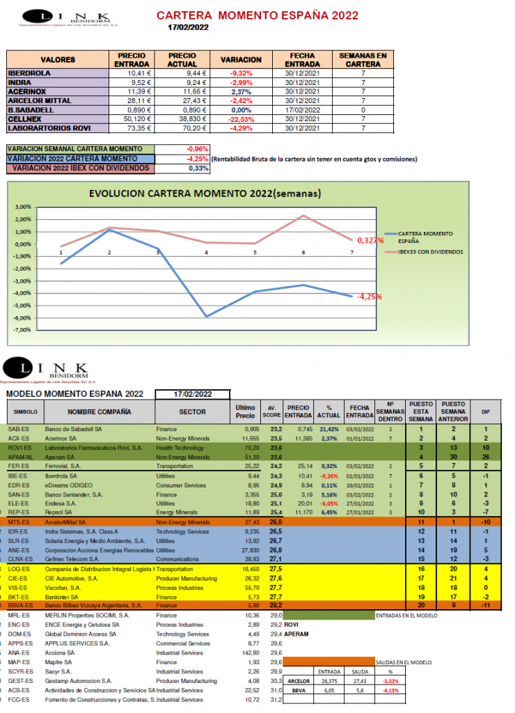 Cartera Momento España 17-02-2022 -0,96% en la semana, -4,25% en 2022