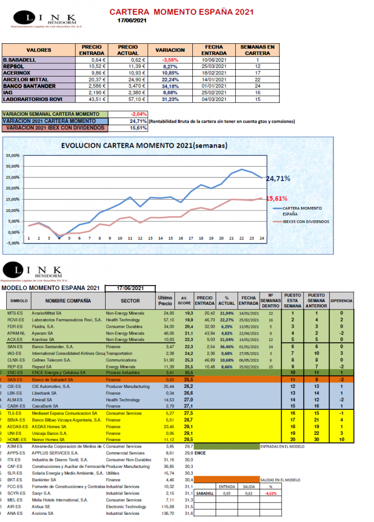 Cartera Momento España 17-06-2021 -2,04% en la semana, +24,71% en 2021