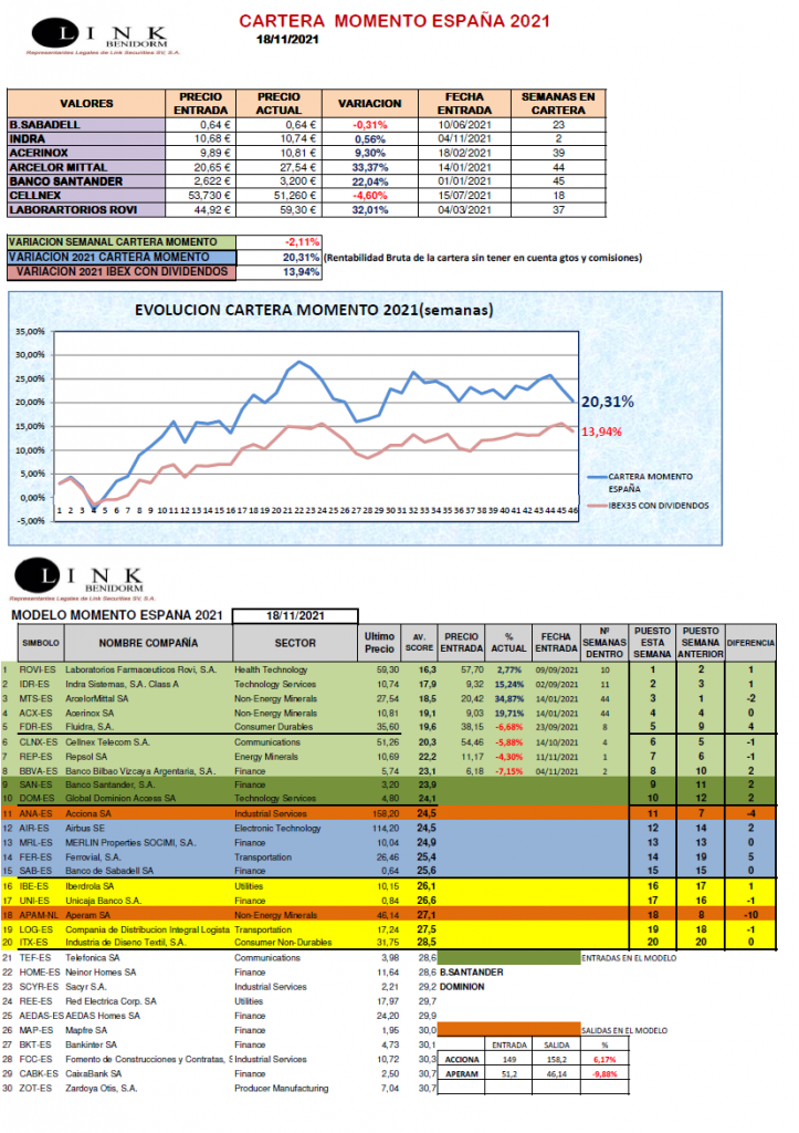 Semana complicada de nuevo en el mercado Español, desmarcándose de lo que han hecho la mayoría de los índices Europeos en los que nuestra CARTERA MOMENTO ESPAÑA no ha sido ajena a dichos descensos. Seguimos sin hacer cambios en la composición de la cartera. Finalizamos la semana con un descenso del -2,11%, situándonos en 2021 con un +20,31%.