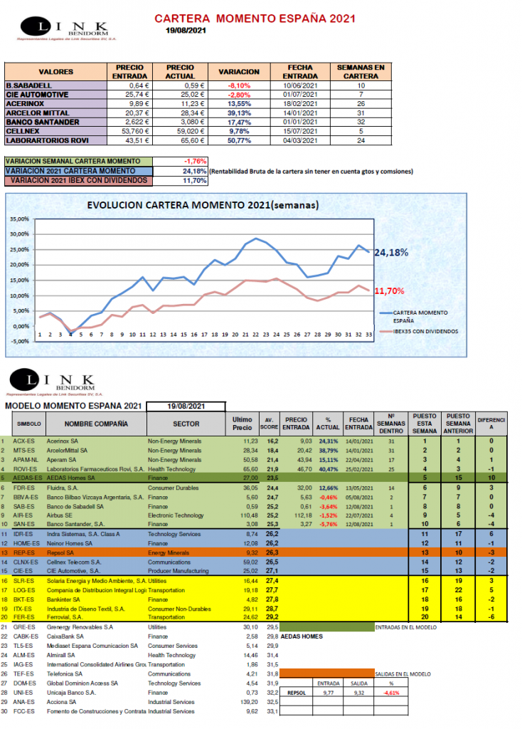 Cartera Momento España 19-08-2021 -1,76% en la semana, +24,18% en 2021