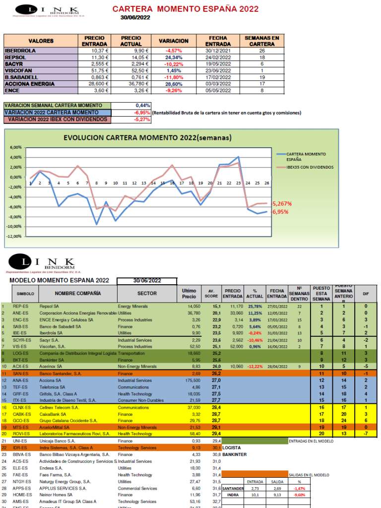 Una vez finalizado un primer semestre muy complicado, con descensos generalizados y profundos en los mercados provocados por varios factores, pero sobre todo por las tensiones inflacionistas que van a provocar un incremento de tipos de interés superior a lo esperado y que puede llevarnos a un escenario de recesión, la guerra entre Rusia y Ucrania, y un mercado muy sobrecomprado en algunos sectores como el tecnológico han hecho que haya sido muy difícil encontrar la “rueda buena” en la selección de valores. Nuestra CARTERA MOMENTO ESPAÑA no ha sido ajena y ha tenido un comportamiento volátil también, pero que se ha mantenido en línea con la bolsa española, haciéndolo mucho mejor que otros índices como apuntábamos en febrero, valores como REPSOL y ACCIONA ENERGIA han mantenido un magnífico tono durante este tiempo y han ayudado a mantener la CARTERA. De cara a la segunda parte del año estaremos muy atentos a las valoraciones que hagan los analistas tras la presentación de resultados de las compañías, en las que exigirán a los gestores que se “mojen” más de cara a las previsiones que tengan en este contexto. Finalizamos el primer semestre de 2022 con un descenso del -6,95% .