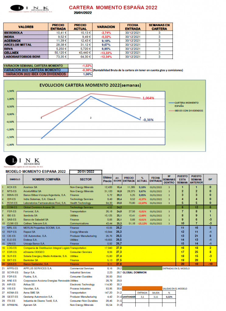 Semana complicada en los mercados que siguen sin animarse y sin una tendencia clara. El comportamiento relativo de nuestra CARTERA MOMENTO ESPAÑA ha sido peor que el mercado en esta semana debido a los descensos de ARCELOR y LABORATORIOS ROVI. Seguimos confiando en la selección de nuestros valores, muy bien colocados en los modelos, que esperamos recuperen posiciones tras el inicio de la temporada de presentación de resultados que está a punto de empezar. Terminamos la semana con un descenso del -1,52% situándonos en 2022 con un -0,36%.