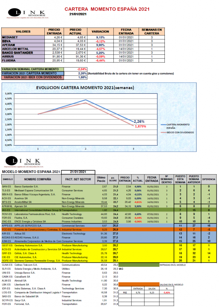 Semana en la que los avances de las restricciones impuestas por el Covid-19 se han trasladado y los mercados se han visto afectados. No hemos hecho movimientos en la CARTERA MOMENTO ESPAÑA, terminando con un retroceso del -2,04%, situándonos en 2021 un +2,26%.