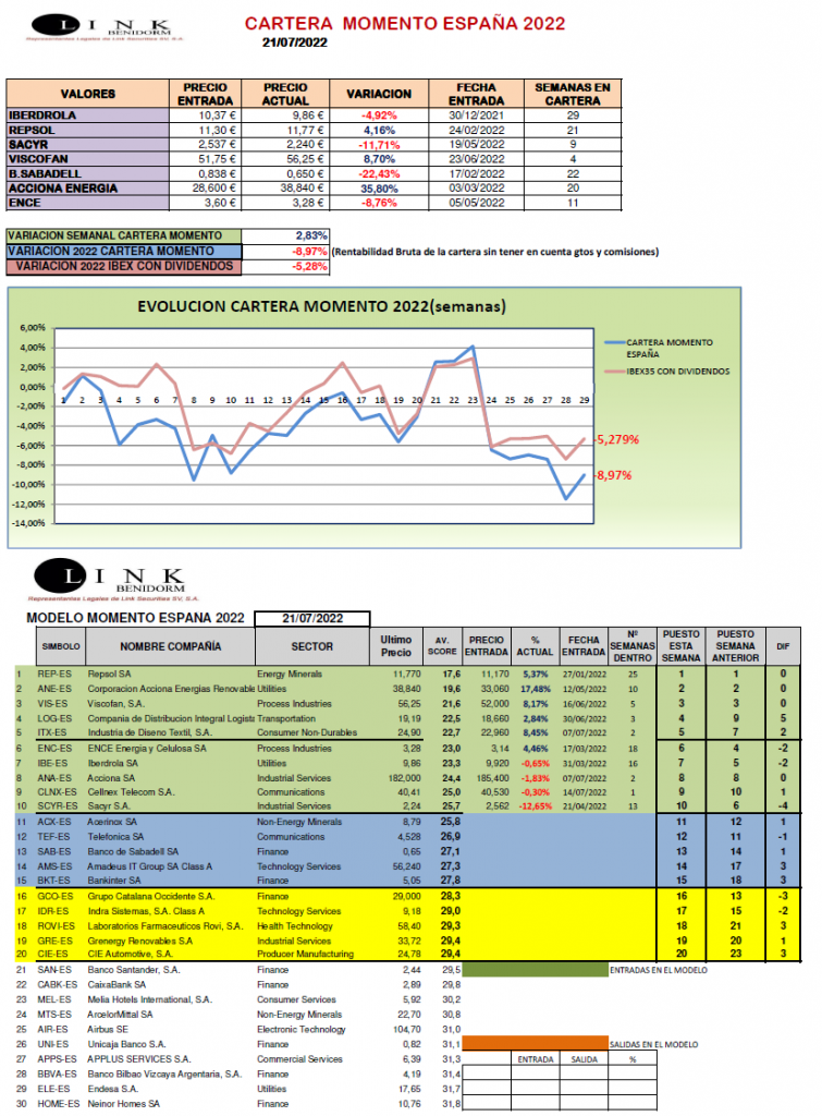 Cartera Momento España 21-07-2022 +2,83% en la semana, -8,97% en 2022