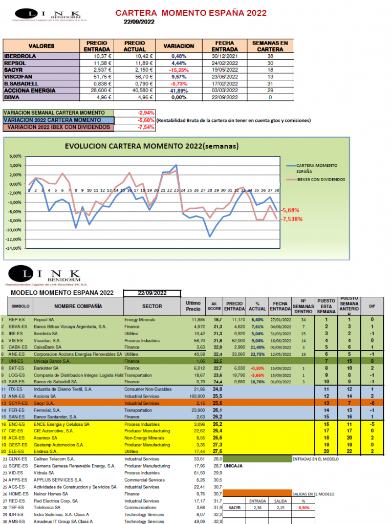 Semana muy compleja, con subidas de tipos de 0,75 p.b por parte de la Fed y las declaraciones (nada tranquilizantes) por parte de Putin que han monopolizado la atención de los mercados y ha hecho que hayamos terminado con caidas. Nuestra CARTERA MOMENTO ESPAÑA ha sufrido con los descensos de SACYR y sobre todo de ENCE, que finalmente se ha salido de la cartera después de 20 semanas con un retroceso del -14,71% incorporando en su lugar a BBVA que en un contexto de subidas agresivas de tipos de interés como el que estamos asistiendo puede ser un buen momento de entrar. Además hemos reducido el peso de BANCO SABADELL, e incrementando el de BBVA. Terminamos la semana con un descenso del -2,94% , situándonos en 2022 con un -5,68%