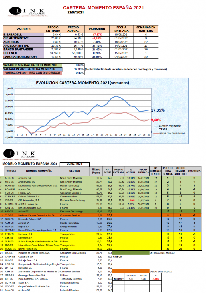 Semana positiva para los mercados aunque también acompañada de bajo volumen de contratación. En nuestra CARTERA MOMENTO ESPAÑA no hemos hecho movimientos. Hemos terminado la semana con una revalorización +0,69%, situándonos en 2021 un +17,35%.