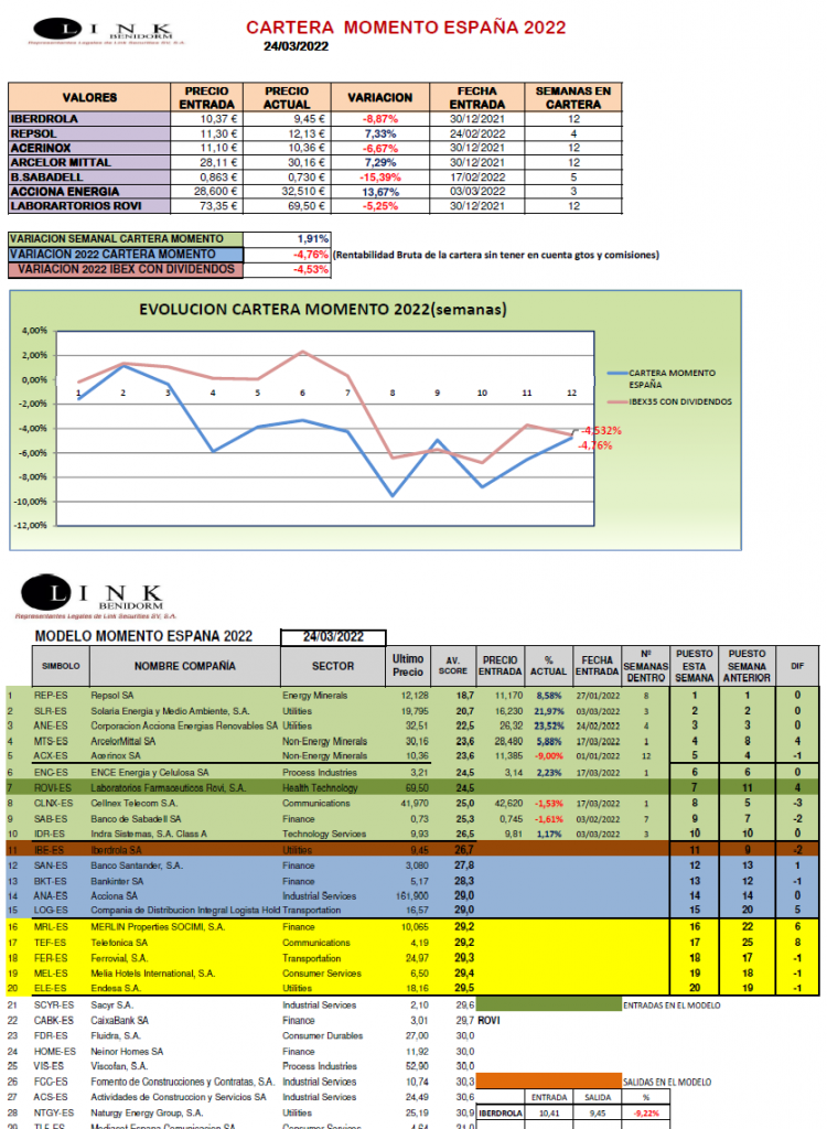 Semana positiva para nuestra CARTERA MOMENTO ESPAÑA. REPSOL, ARCELOR, ACERINOX Y LABORATORIOS ROVI han tenido un buen comportamiento que ha compensado el retroceso de IBERDROLA debido a las dudas que hay respecto a las medias que pueda adoptar el Gobierno y que puedan afectarla. No hacemos cambios ni ajustamos pesos en la Cartera. Concluímos la semana con una revalorización del +1,91% situándonos en 2022 con un -4,76%.