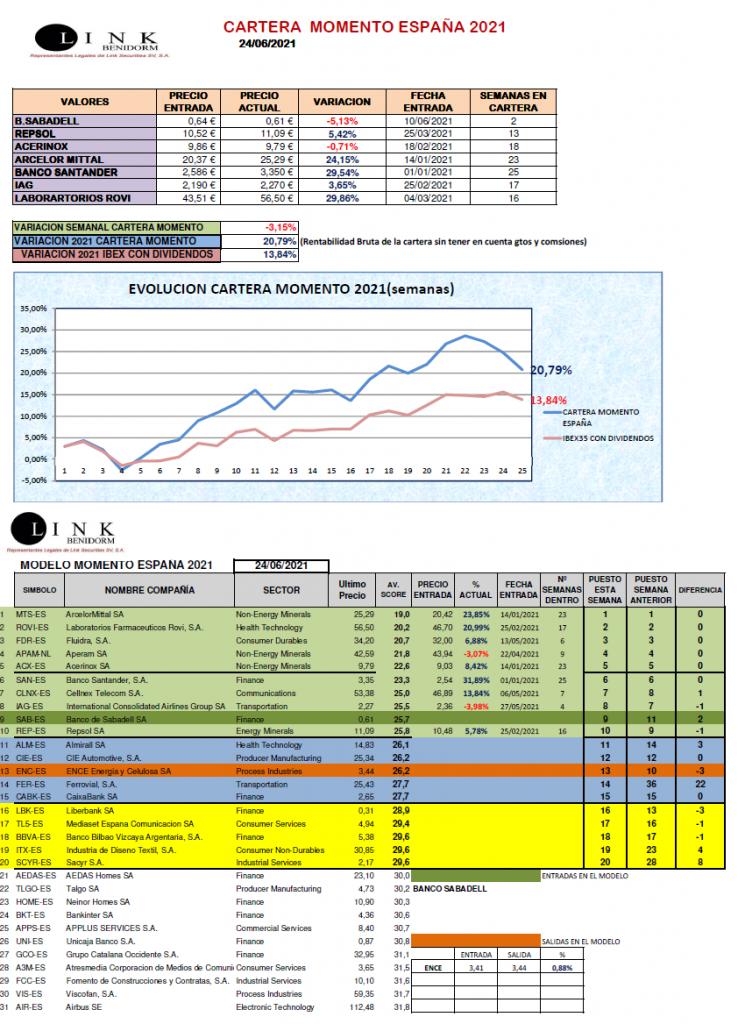 Semana negativa de nuevo en los mercados y en la que nuestra CARTERA MOMENTO ESPAÑA , ha sufrido por los descensos de ACERINOX (penalizada por la salida de una participación significativa de un accionista relevante), IAG y los bancos. Hemos finalizado la semana con un descenso del -3,15%, situándonos en 2021 un +20,79%.