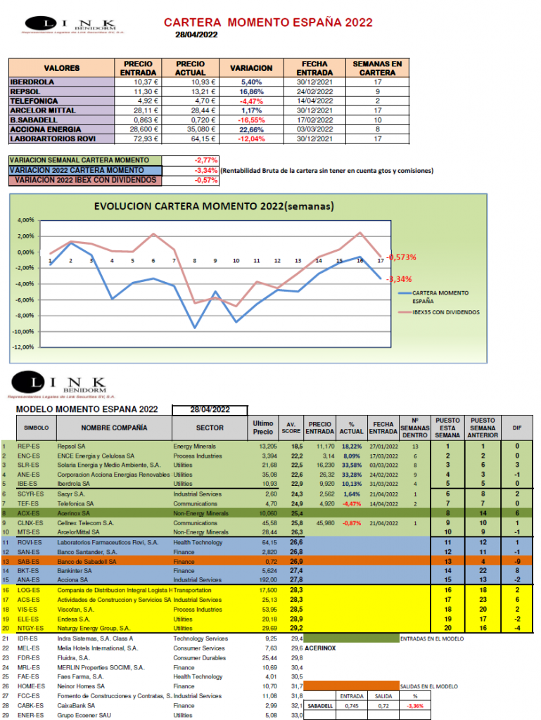 Semana complicada. En esta ocasión han sido los valores pertenecientes al sector bancario, a pesar de las buenas previsiones tras la presentación de resultados de varias entidades junto con valores relacionados con Materias Primas a los que les ha tocado corrección. En nuestra CARTERA MOMENTO ESPAÑA no hacemos cambios y concluímos la semana con un retroceso del -2,77% situándonos en 2022 con un -3,34%.
