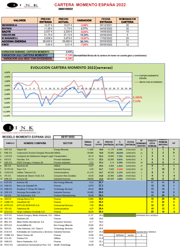 Cartera Momento España 28-07-2022 +2,03% en la semana, -7,13% en 2022
