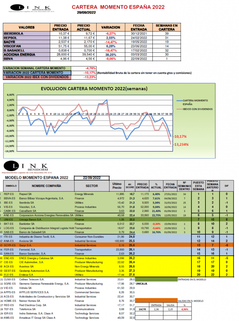 Semana muy difícil en los mercados con fuertes descensos generalizados en todos los sectores. Nuestra CARTERA MOMENTO ESPAÑA a pesar de haberse comportado mejor que el mercado, no ha podido escapar a esas bajadas. No hacemos cambios en la composición de la cartera y seguimos confiando claramente en nuestros valores, que es bajo nuestro criterio dónde uno debe estar en estos momentos, y toca esperar. Finalizamos la semana con un retroceso del -4,76% , situándonos en 2022 con un -10,17%